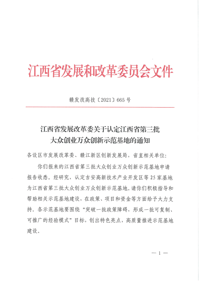 近日,省發(fā)改委印發(fā)《江西省發(fā)展改革委關(guān)于認(rèn)定江西省第三批大眾創(chuàng)業(yè)萬(wàn)眾創(chuàng)新示范基地的通知》(贛發(fā)改高技〔2021〕665號(hào)),我公司認(rèn)定為江西省第三批大眾創(chuàng)業(yè)萬(wàn)眾創(chuàng)新示范基地。